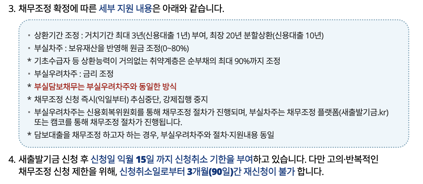 핵심은 정부와 금융기관이 함께 부실채권을 매입해 채무자를 대상으로 원금 감면, 이자 면제, 상환 유예 등의 혜택을 제공하는 것입니다.
